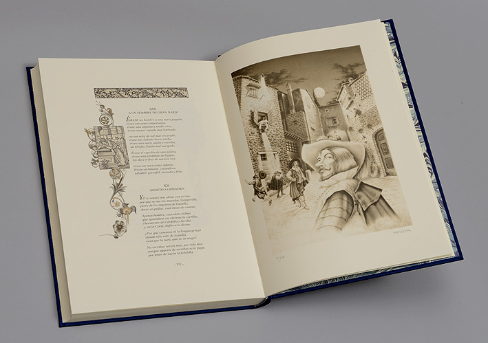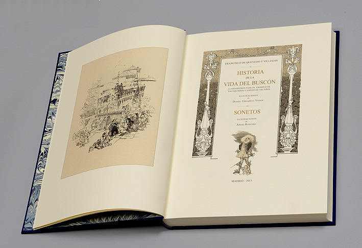 Madrid, 2013. 35 x 25 cm. Con 16 láminas y dibujos de Daniel Urrabieta Vierge el en texto de El Buscón y 7 láminas y capitulares historiadas de Ángel Roncero en el de los Sonetos. Introducción a la obra por Helena Calero Echarte. Encuadernación en seda azul con estampaciones en dorado. Edición limitada en papel de hilo verjurado.